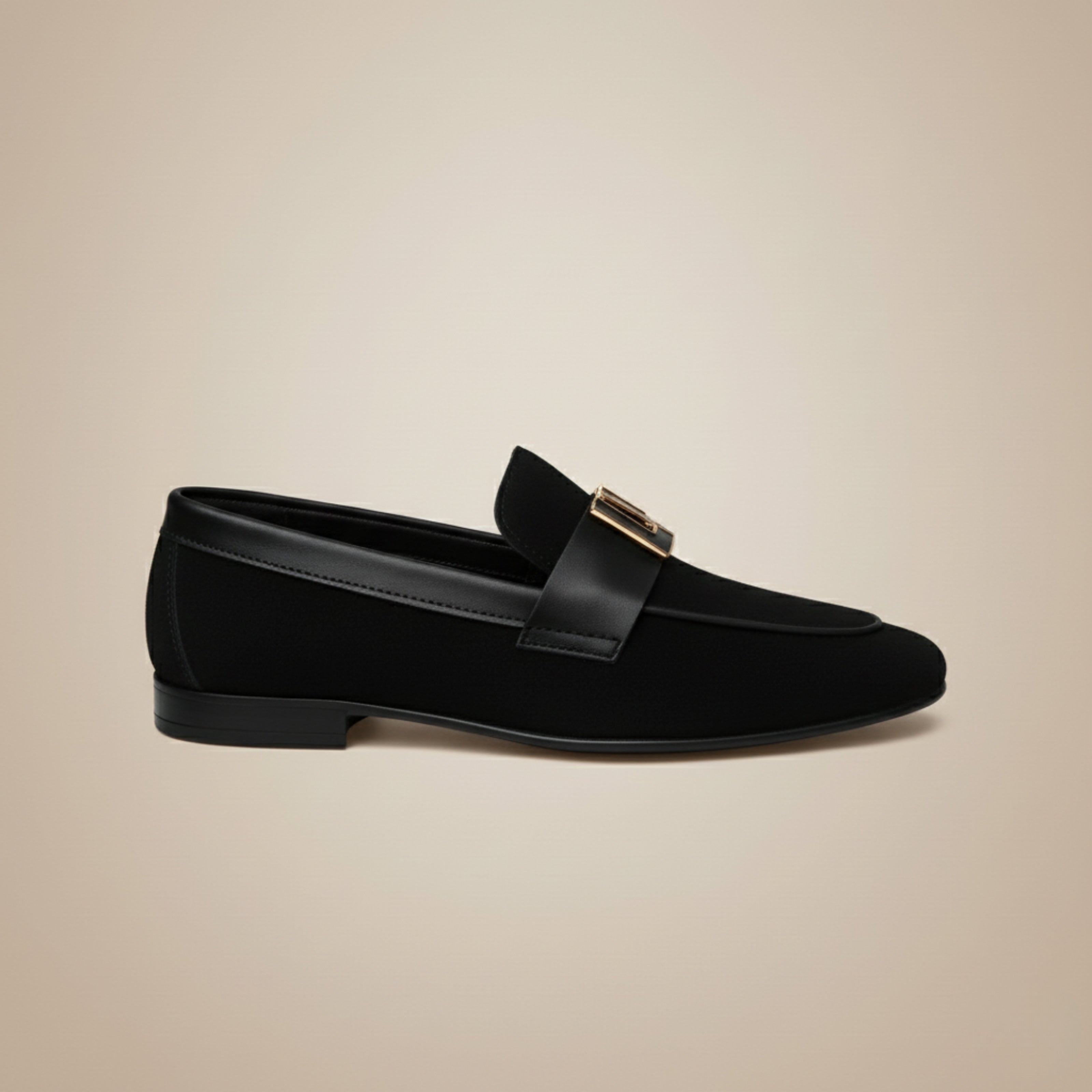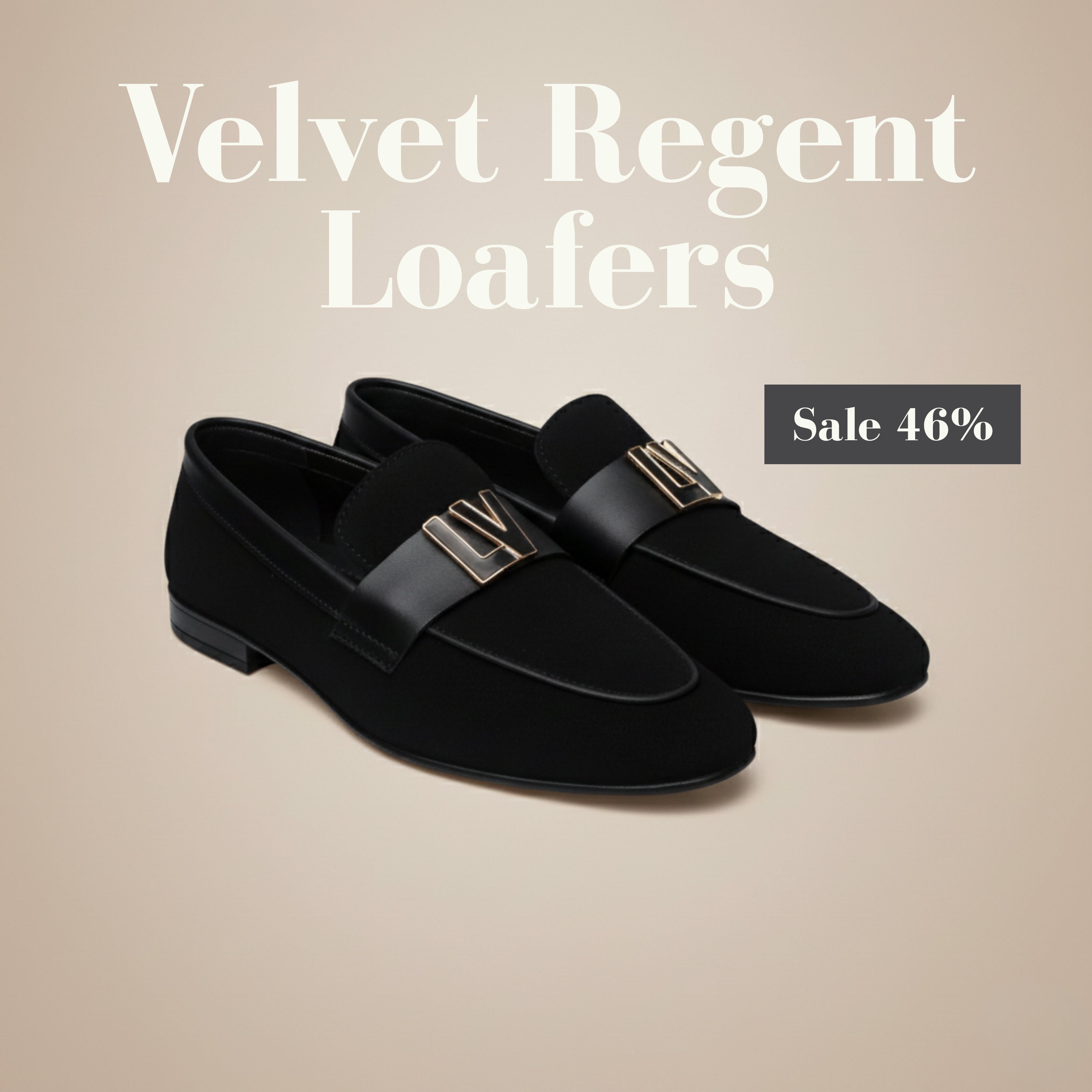 Elevate your elegance with the Velvet Regent Loafers — a sophisticated blend of suede finesse and contemporary detail. These loafers feature a rich black velvet-textured upper paired with a sleek leather strap, highlighted by a striking gold-accented buckle. The design effortlessly combines modern luxury with timeless appeal, making them the perfect statement for formal events or stylish evenings out.